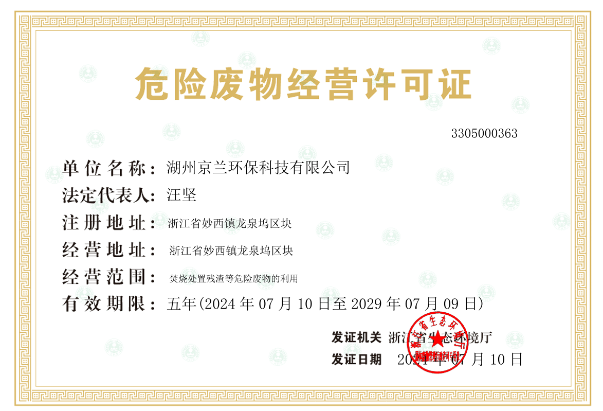 喜報!湖州京蘭環(huán)保順利完成危險廢物五年期經營許可證換證工作