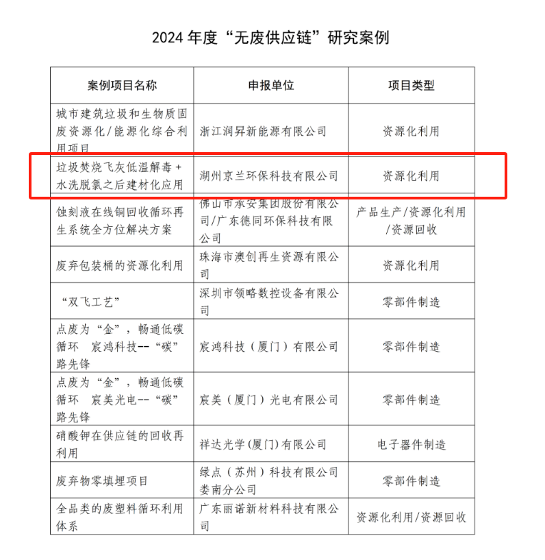 根據案例研究及匯報情況,本年度評選出10項“無廢供應鏈”評價試點及10項“無廢供應鏈”研究案例。湖州京蘭環(huán)保科技有限公司憑借 “垃圾焚燒飛灰低溫解毒 + 水洗脫氯之后建材化應用” 項目脫穎而出,成功入選 “無廢供應鏈” 研究案例。